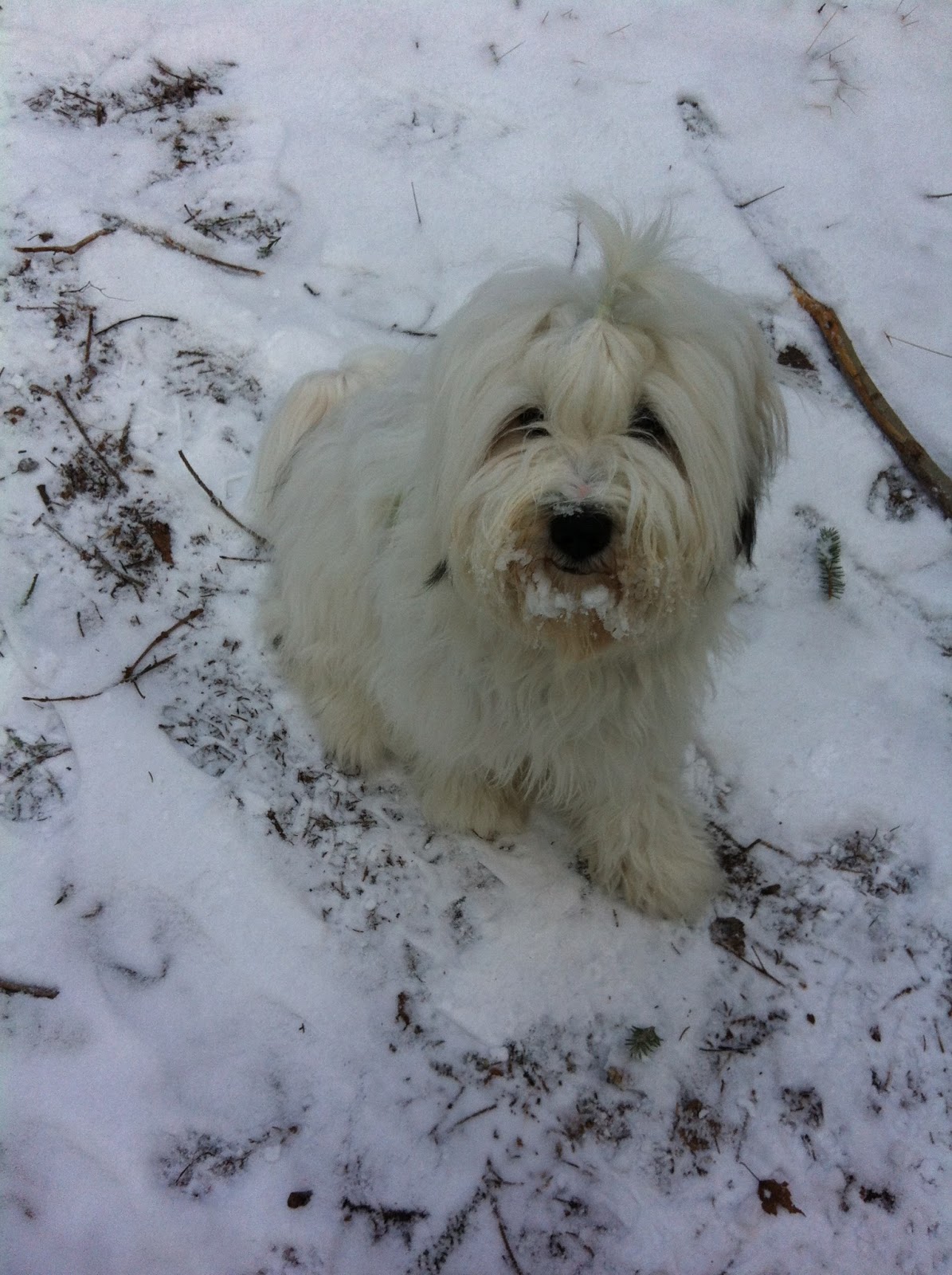 Da vi kom tilbake fra den to timer lange turen vår i dag, fikk jeg for første gang hilse på en av de to søtingene som bor i garasjen om vinteren. Først måtte jeg knurre litt, men da Hoffnarren tok den ene ut av buret, snuste og hilste jeg. Jeg slikket ham til og med på snuten, og fikk et lite flashback til Tønsberg, da jeg passet på valpene til Hildur.